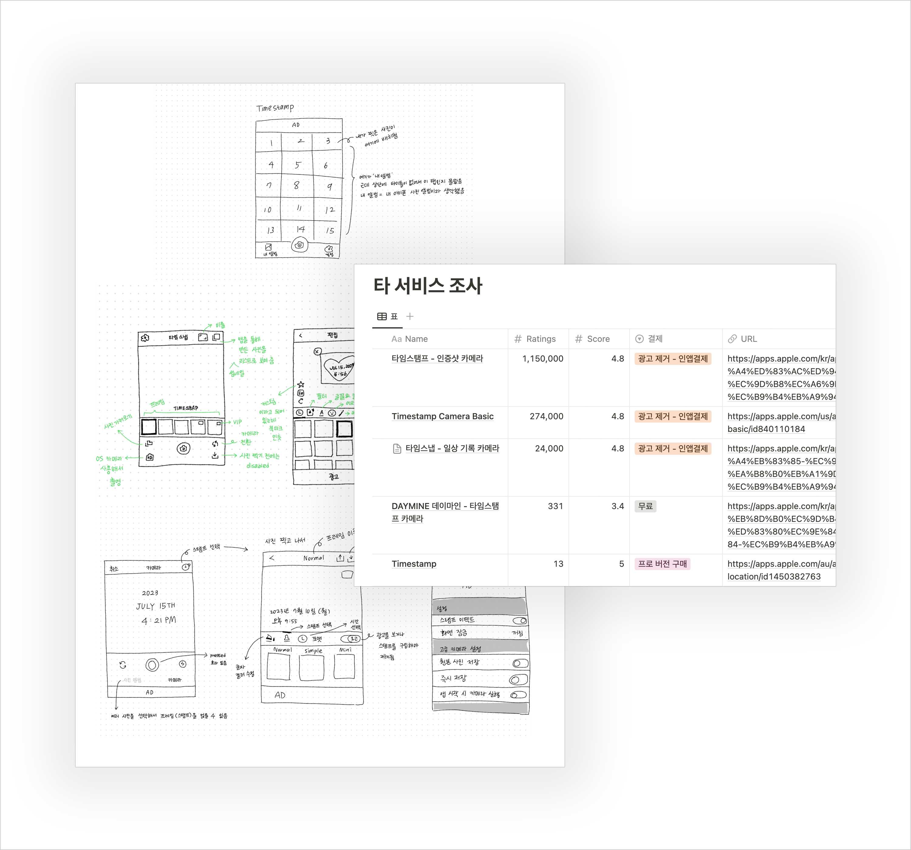 우선 레퍼런스 조사를 했다. 현재 타임스탬프 앱들의 하이어라키는 어떻게 되어 있는지, UI는 어떻게 구성되어 있는지, 어떤 기능들을 제공하는지, 사용자들의 피드백은 어떤지, 그리고 제일 중요한 비즈니스 모델도 조사한다. 이 과정은 손으로 직접 타 서비스들의 앱을 스케치도 하고, 표로 만들어서 정보를 비교하기도 한다.